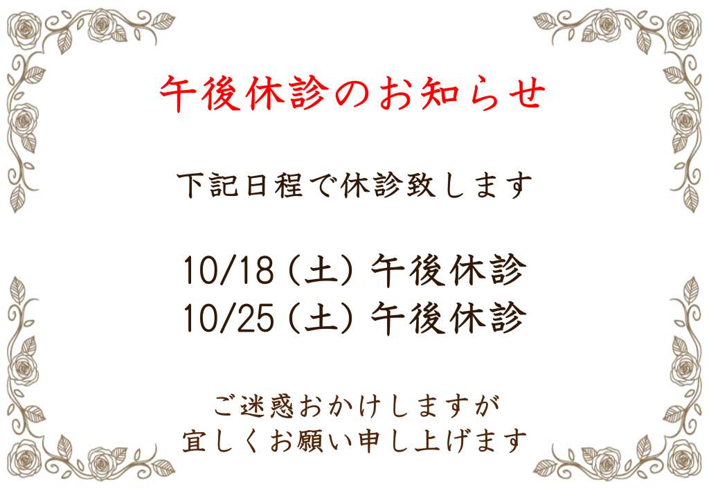 10/18(土)と10/25(土)は午後休診いたします。