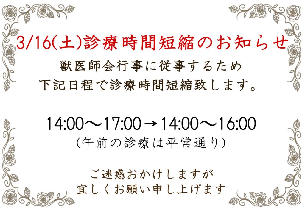 3/16(土)診療時間短縮のお知らせ Uncategorized 2024-02-10 3/16(土)は獣医師会行事に従事するため、午後の診療時間が通常と異なりますのでご注意ください。(午前の診療は平常通りです。)ご迷惑おかけしますがよろしくお願いいたします。
